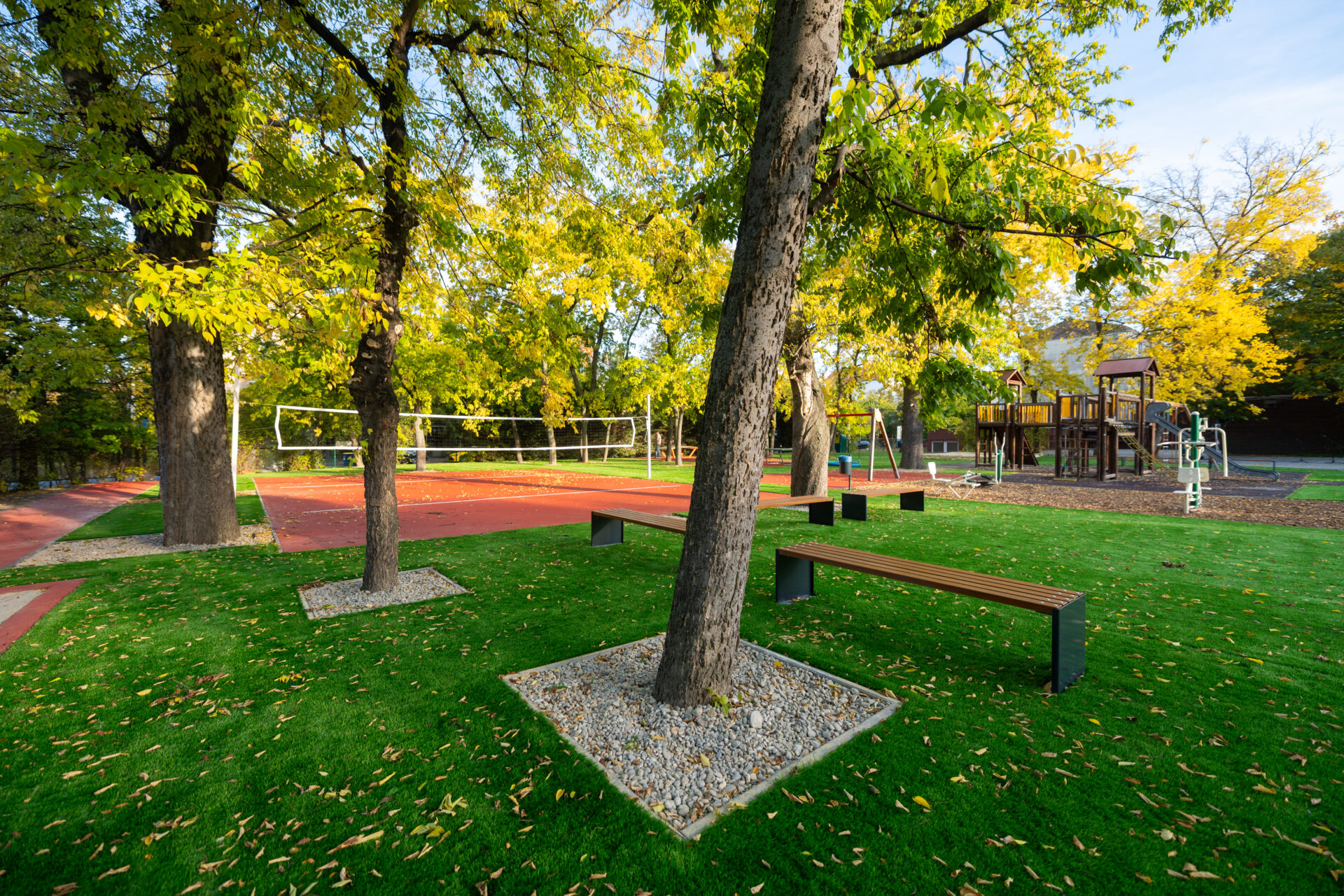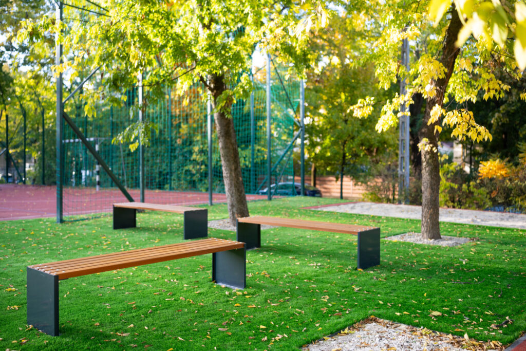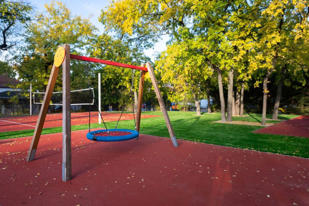 A közösségi terek kényelmét 92 pad, 6 asztal és 62 hulladékgyűjtő növeli, míg a játszózónákban 18 új játszóelem — például játszóvár, trambulin és gumiburkolatba épített sakk- és malomtábla — várja a gyerekeket.